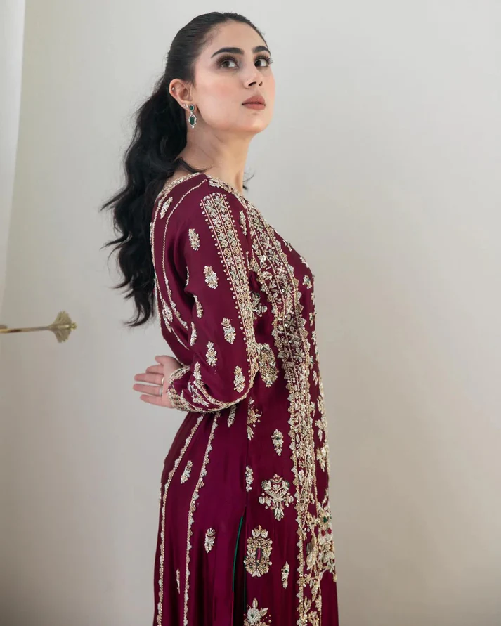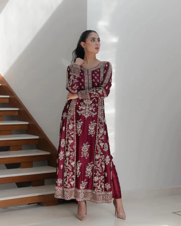 A rich deep-maroon outfit beautifully crafted with fine silver threadwork and elegant floral embroidery. The premium fabric drapes effortlessly, showcasing detailed motifs inspired by timeless Eastern artistry. Designed in a flattering straight silhouette with full sleeves and a classic round neckline, this ensemble blends tradition with refined sophistication. The ornate borders and luxurious embellishments make it a perfect pick for festive celebrations, wedding events, and formal occasions.