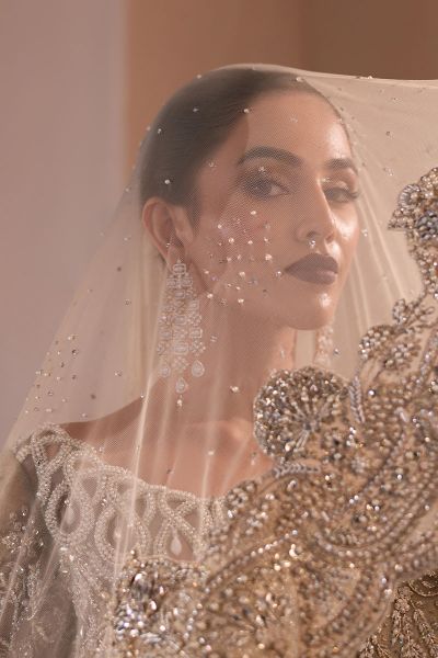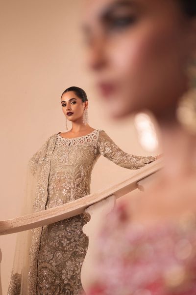 The “Aurora” gown radiates sophistication with its exquisite embroidery and intricate detailing. Its long, flowing silhouette is enhanced with sparkling beadwork, offering a luxurious and eye-catching appeal for special occasions. A distinctive cut-out neckline adds a contemporary touch to this traditionally inspired design. Completed with a sheer dupatta that perfectly complements the ornate embroidery, this ensemble creates a timeless, elegant look—perfect for weddings, receptions, or formal celebrations.