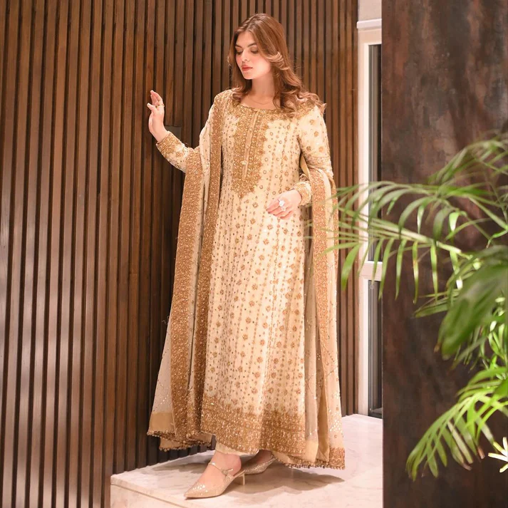 Explore the refined charm of the BKZ69 long straight A-line golden kurta. Designed for all occasions, it delivers both comfort and graceful style. Order online across Pakistan and benefit from exclusive discount offers.