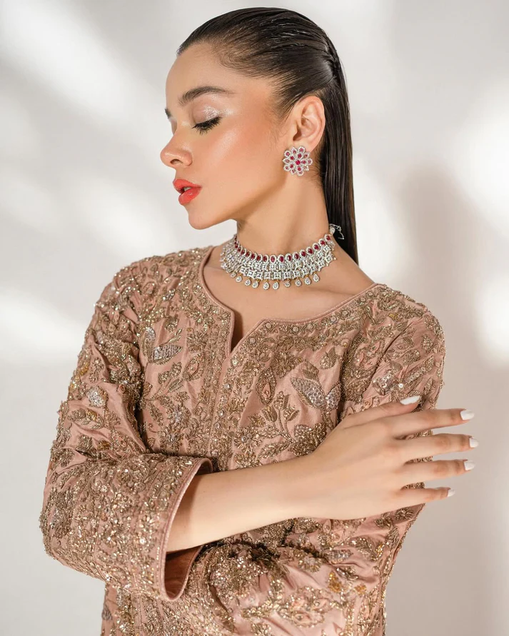 Step into timeless elegance with Honey Waqar’s Pakistani Formal Wedding Edition ensemble, crafted in luxurious rose-gold fabric. Adorned with intricate embroidery and shimmering embellishments, this outfit exudes opulence, making it a perfect choice for weddings and grand celebrations. The regal silhouette is complemented by delicately detailed trousers and a gracefully draped dupatta, adding a sophisticated finishing touch. Handcrafted with precision, this exquisite ensemble is designed for those who seek unmatched elegance and style.