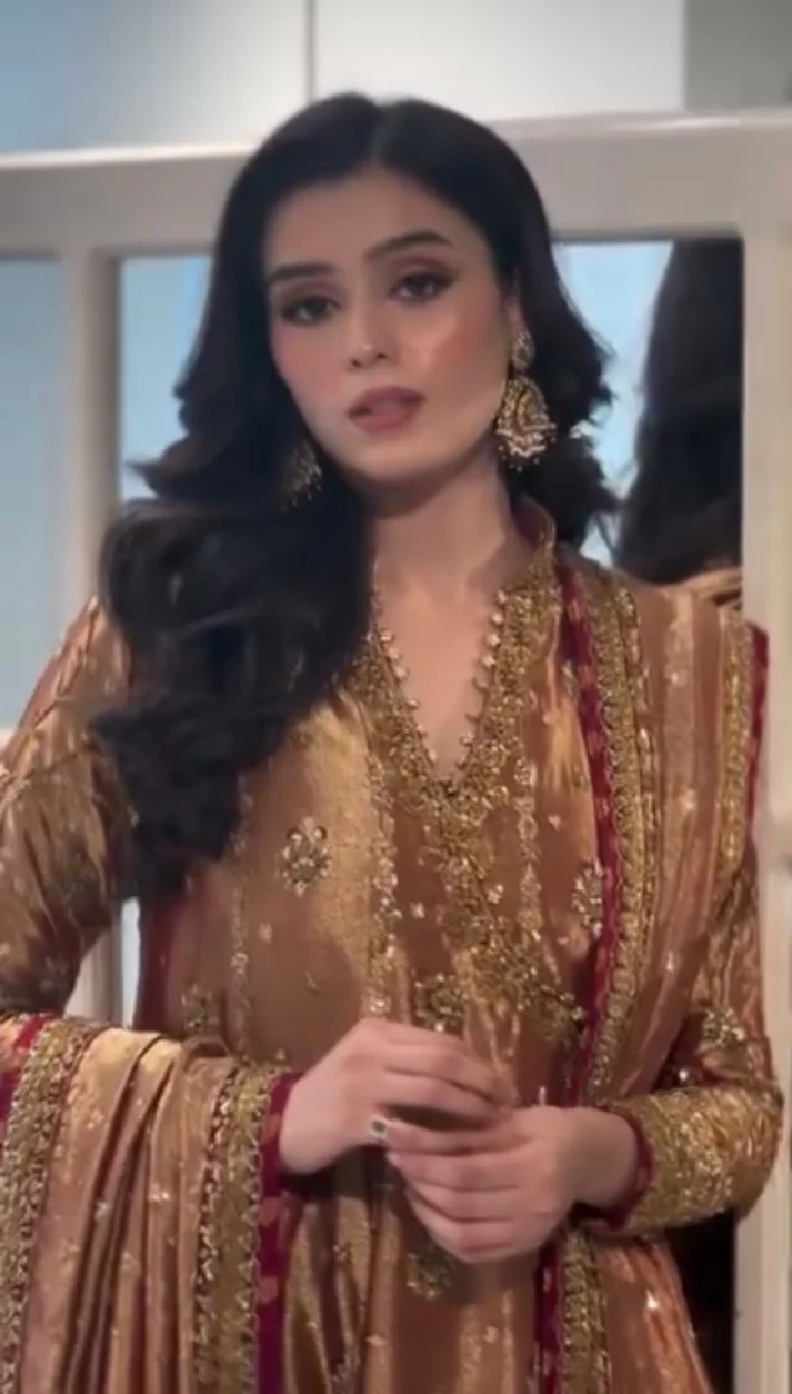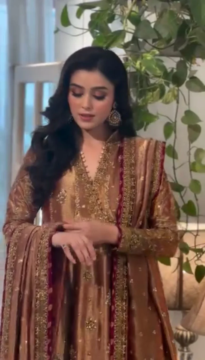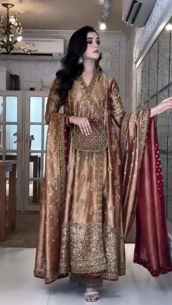 An exquisite formal maxi in a luxurious bronze hue, beautifully embellished with delicate embroidery and intricate detailing. The look is elevated with a deep maroon dupatta featuring finely crafted borders, making it an elegant choice for formal gatherings and special occasions.