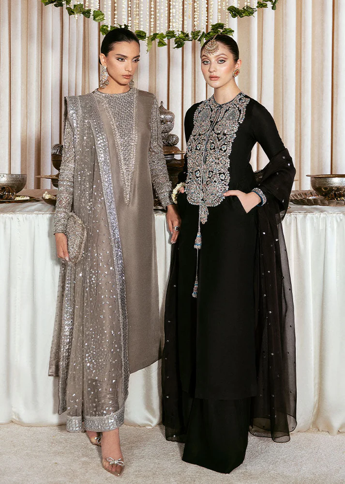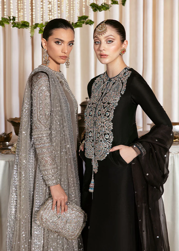 A regal black ensemble exuding timeless grace. The front panel is beautifully hand-embellished with intricate silver zari, dabka, and crystal work, forming rich floral patterns. The sheer dupatta, lightly sprinkled with sequins, adds a soft, elegant touch. Perfect for formal evenings — classic, graceful, and luxuriously detailed. ✨