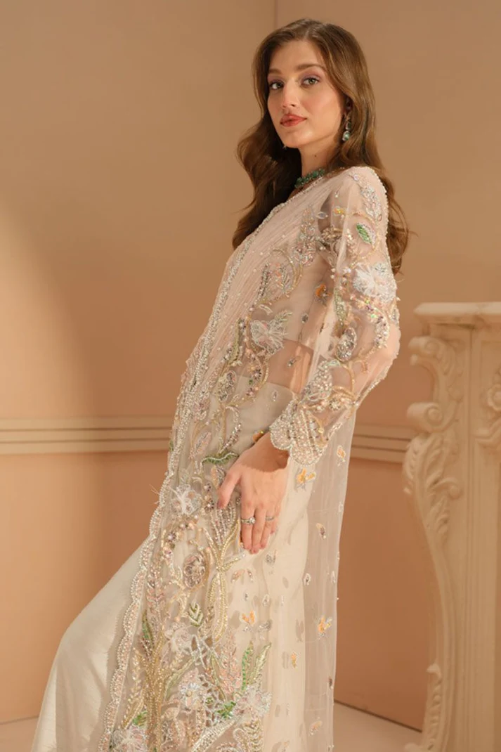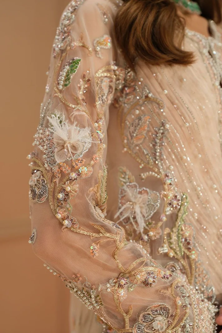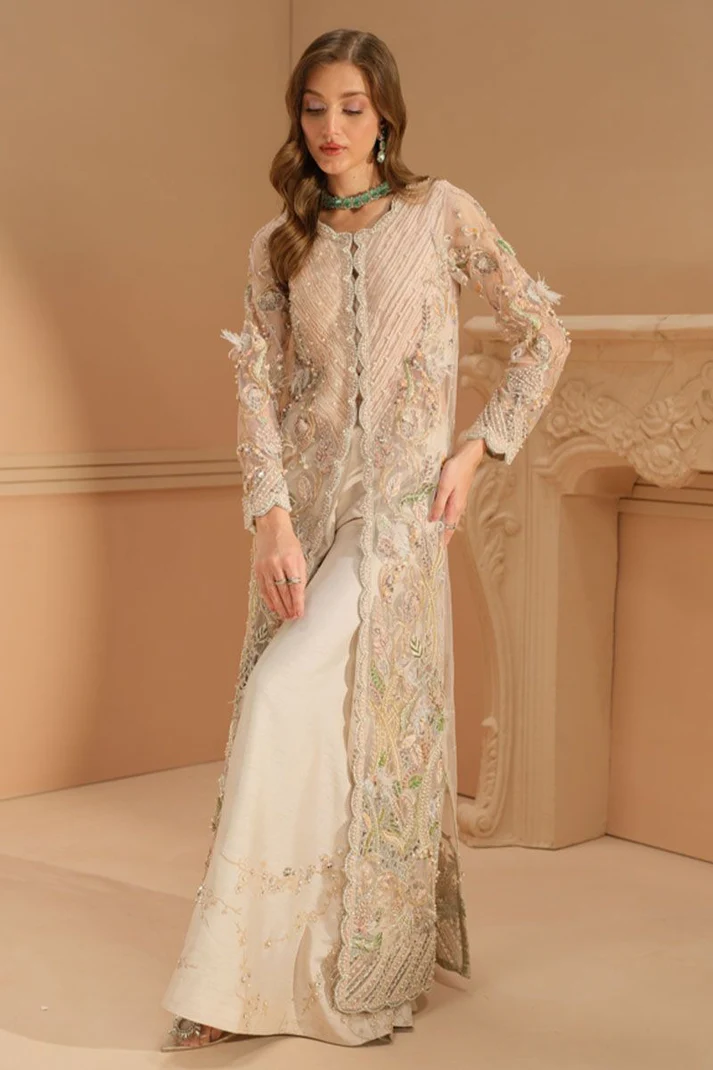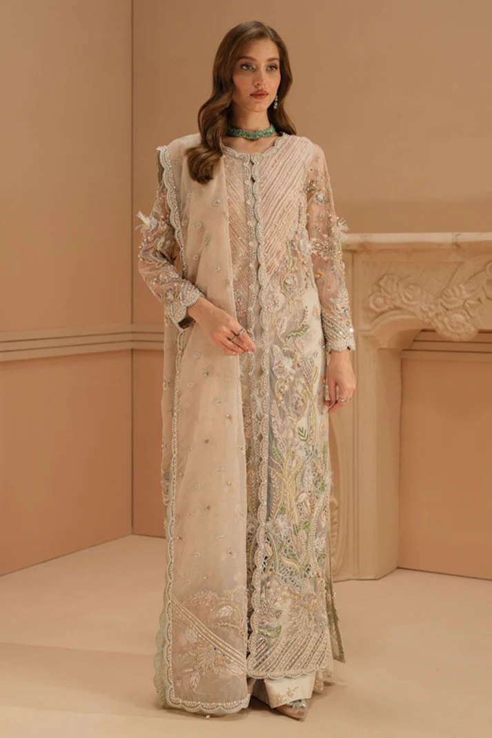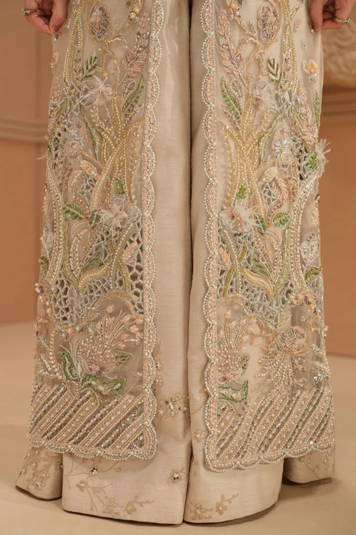 This elegant soft-beige ensemble exudes timeless sophistication and contemporary charm. Adorned with delicate beadwork, intricate thread embroidery, and subtle sequins, it creates a soft, ethereal shimmer. The lightweight organza fabric enhances its graceful flow, while scalloped detailing along the neckline and front adds a touch of refined elegance. Perfect for formal gatherings, engagements, or festive celebrations, this outfit embodies understated luxury and effortless beauty.