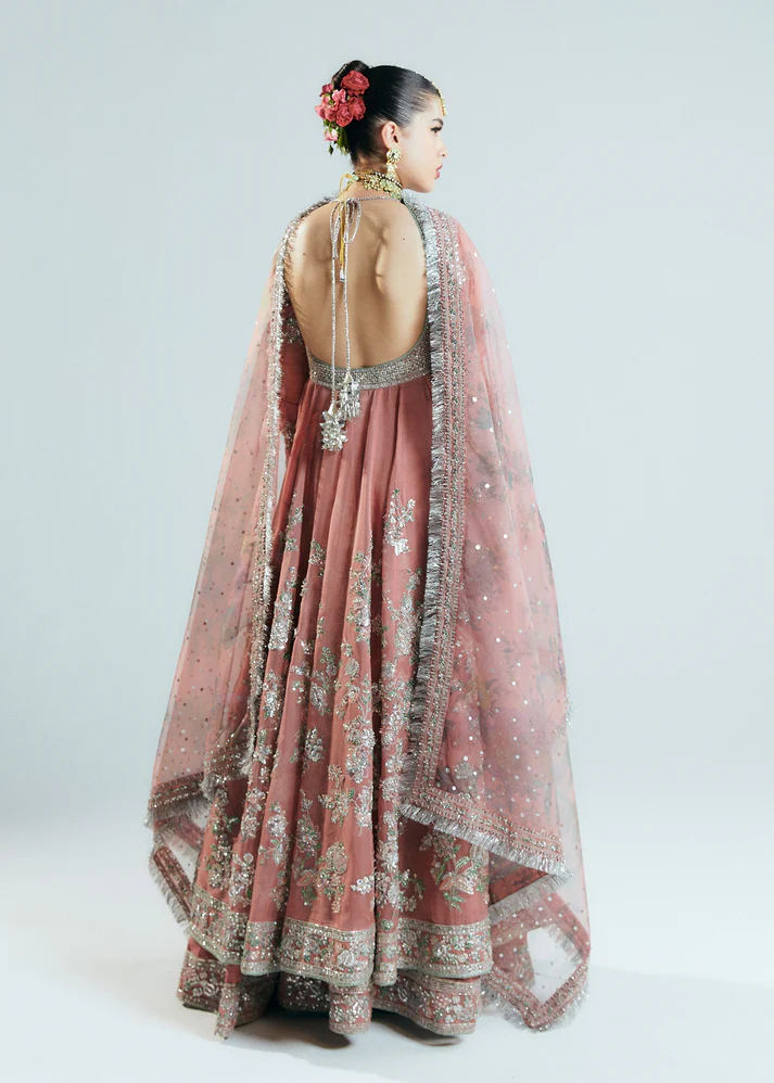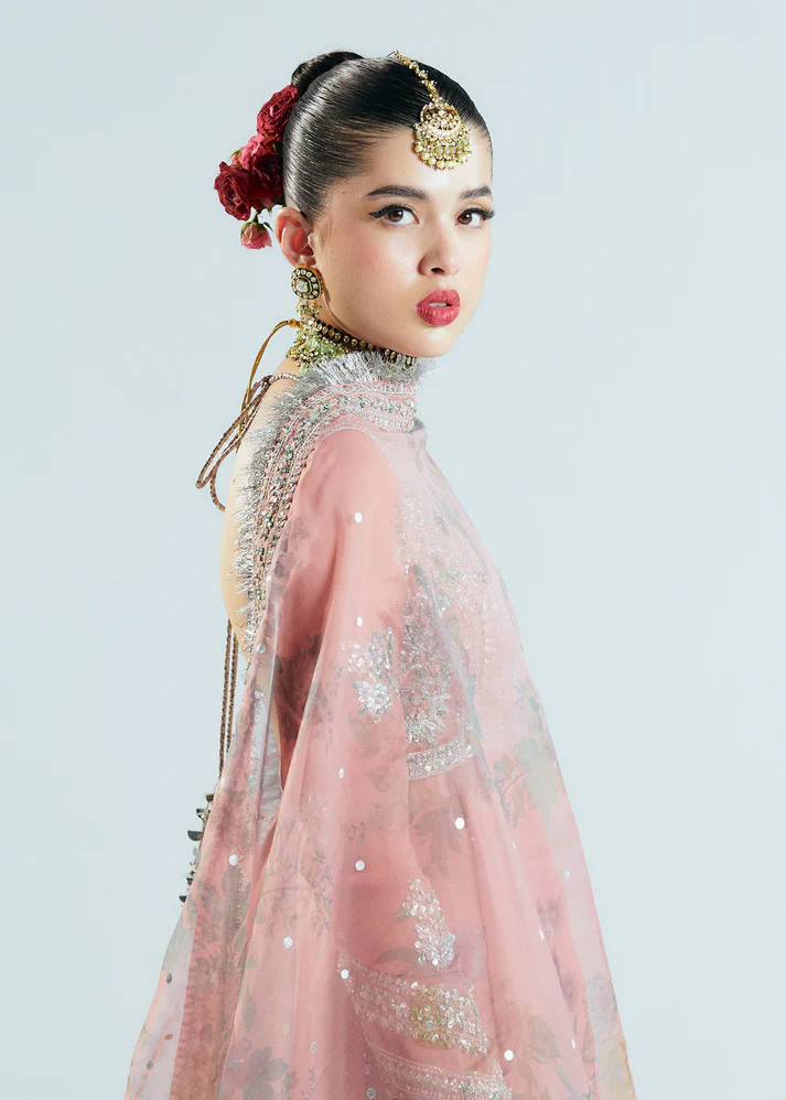 A Classic Coral organza Peshwas intricately embellished with silver dabka, naqshi and sequins. Further it is paired with korean rawsilk sharara with heavy embellished border completing the over all look with digital printed dupatta enhanced with foil print and heavy embellished border. Detailed embellishment on the entire outfit makes it a perfect fit for any formal occasion.